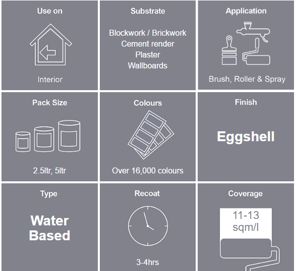 • High performance, tough acrylic resin based interior paint particularly suitable for use in high condensation areas and does not yellow.