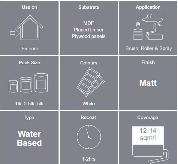 A high performance, water-borne, combined primer and undercoat specifically formulated for use on medium density fibreboards. It provides a low odour, quick drying alternative to conventional solvent-borne primers producing an ideal surface for overcoating with subsequent topcoat.