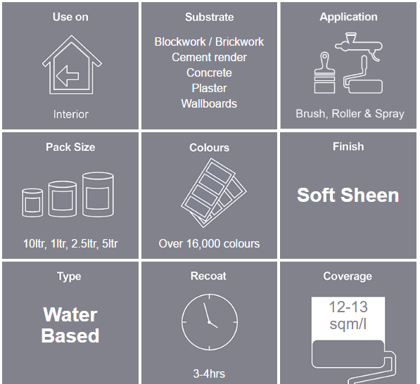 • Mid sheen emulsion that withstands normal levels of humidity and can be wiped clean.